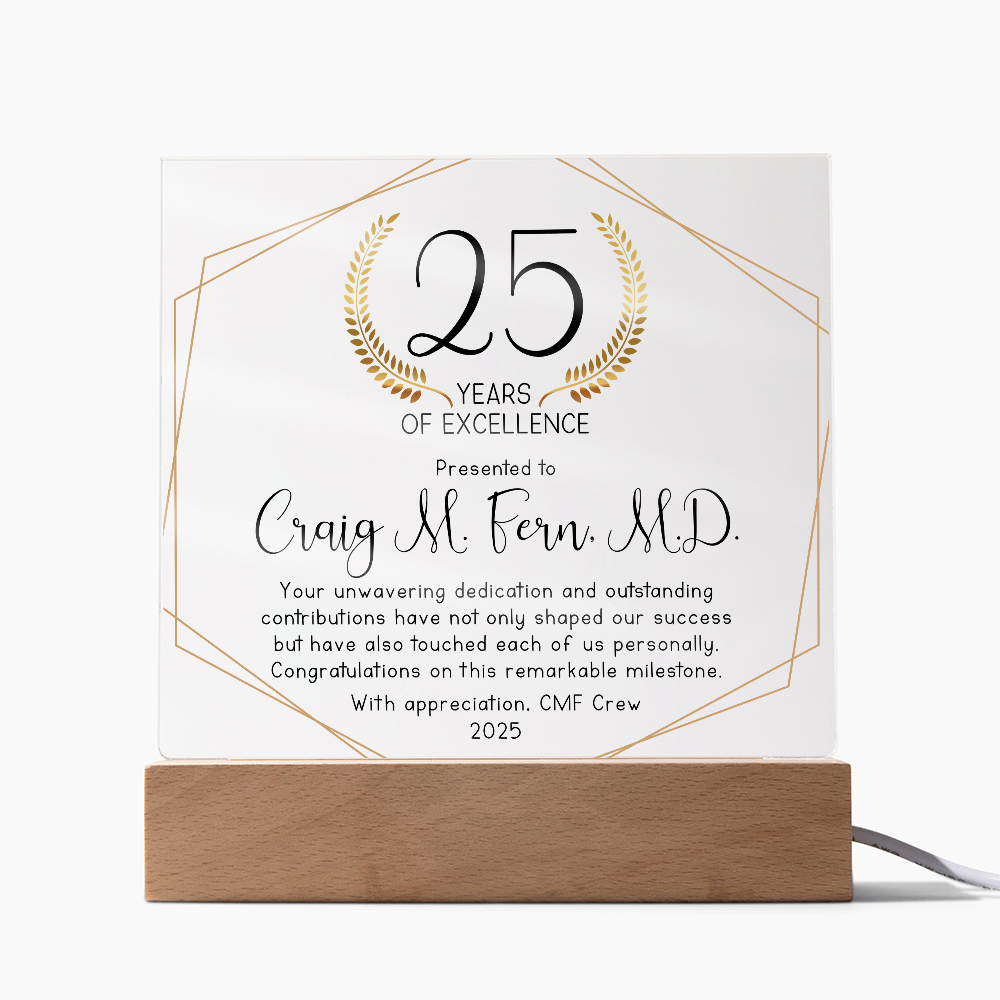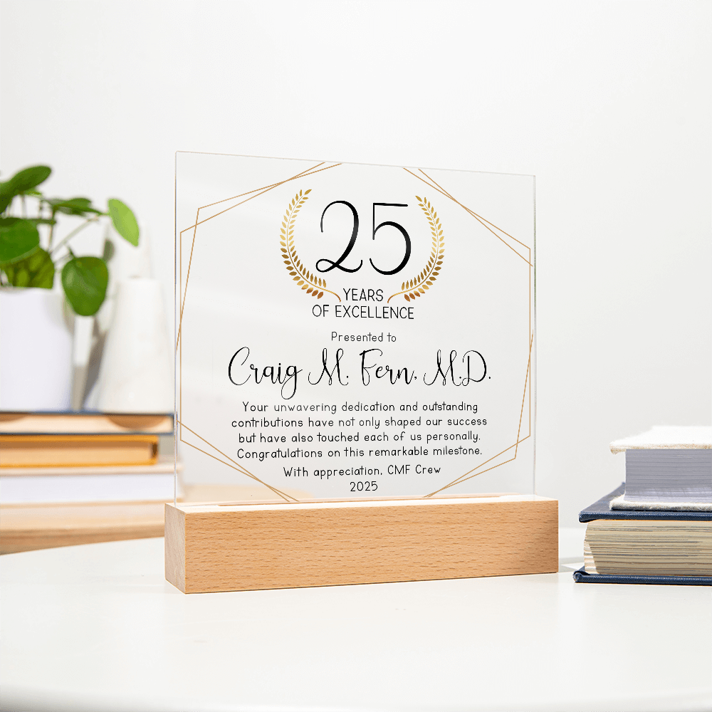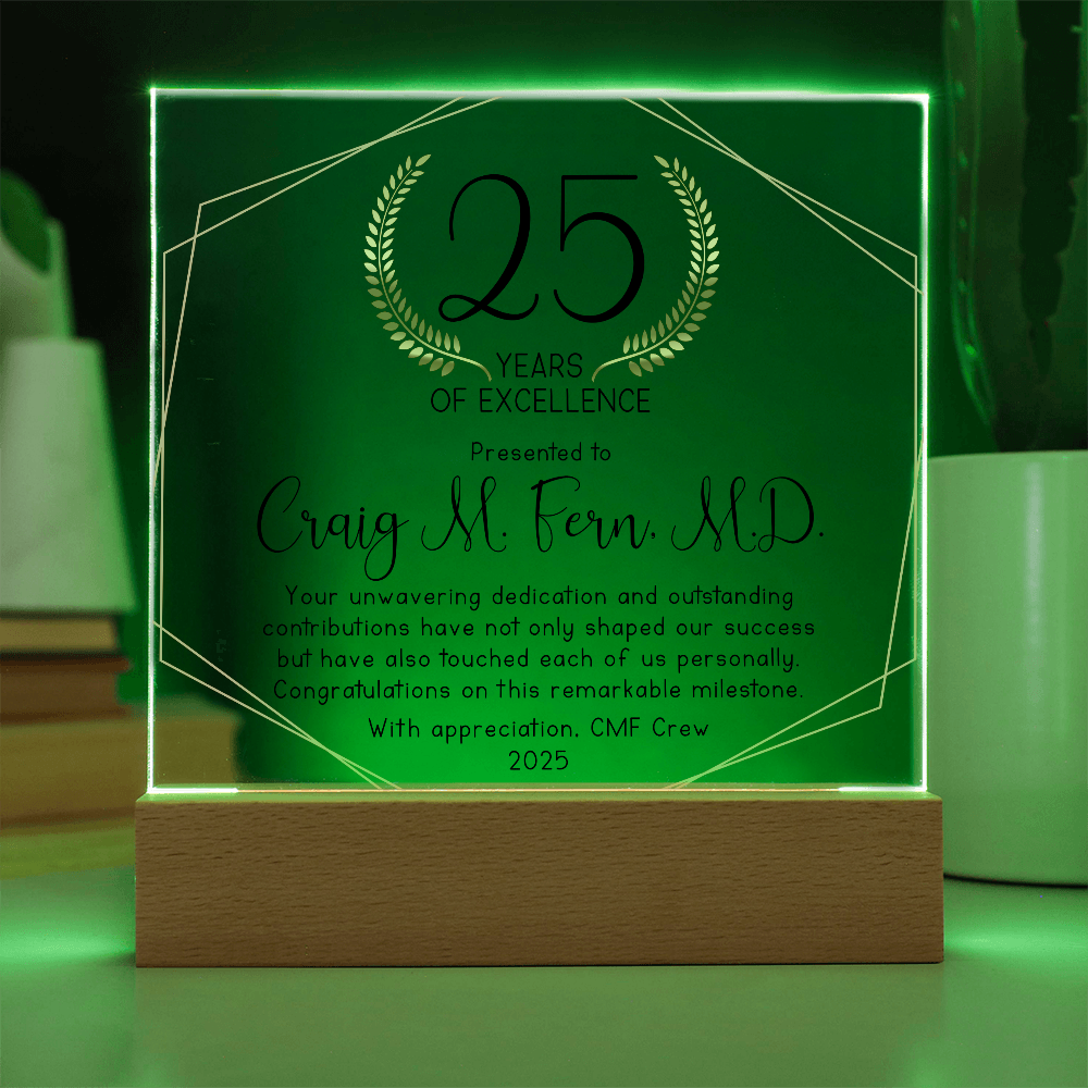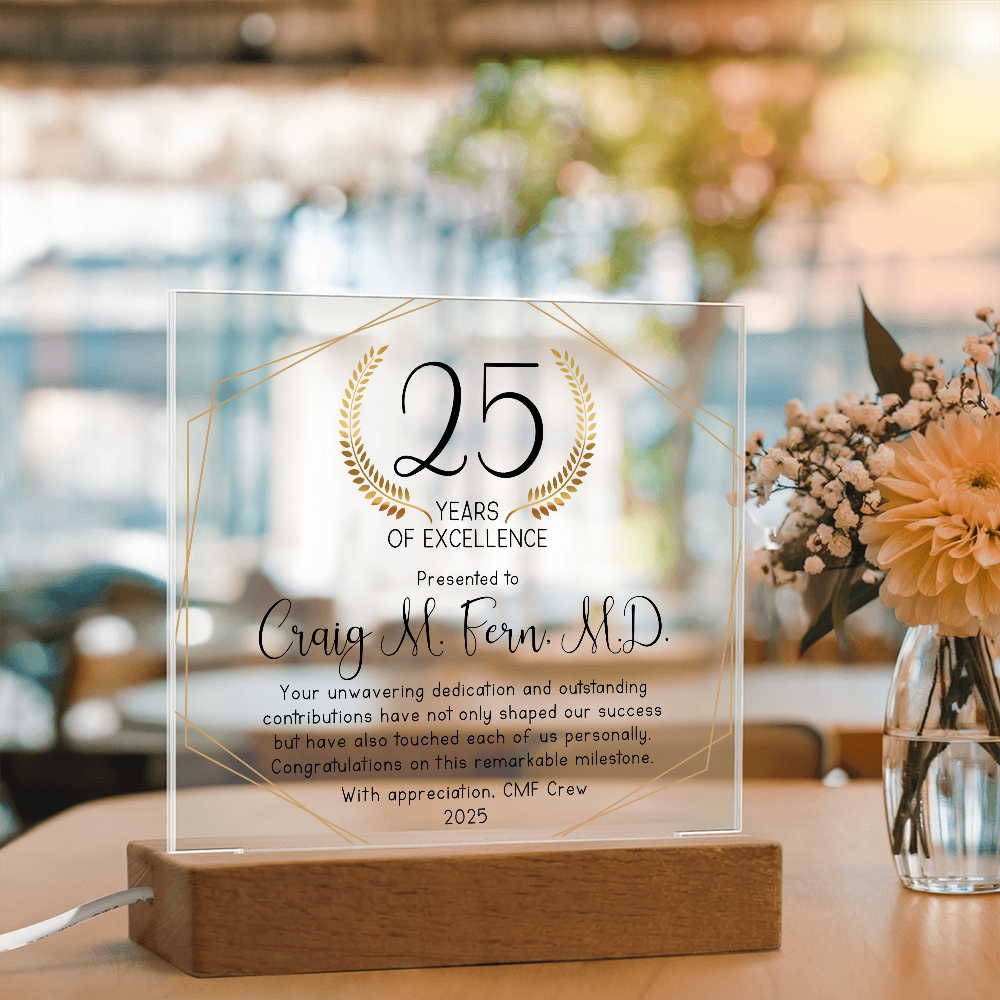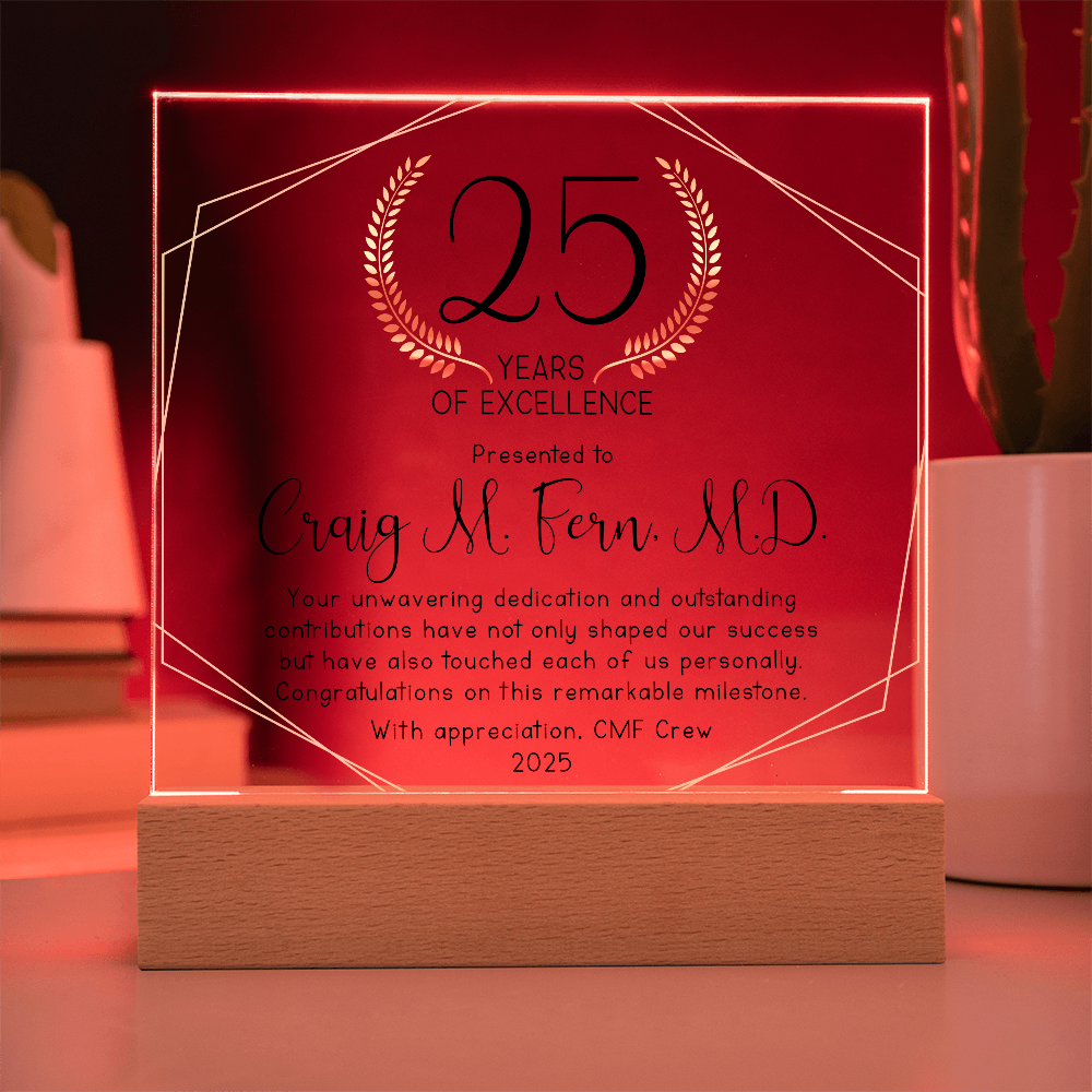 Your plaque will be crafted from premium acrylic with a professionally printed design for a polished look. It comes with a stylish wooden LED base, and you can choose between a USB plug-in option OR a cordless battery-operated option (requires 2 AAA batteries, not included). Both LED bases feature 7 vibrant colors, allowing the user to customize the lighting with various color changes and dynamic cycles.